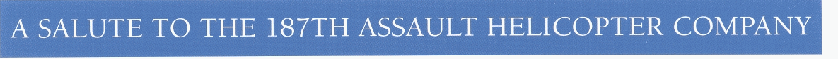 It is commonly accepted that the helicopter crewmembers suffered some of the highest casualty rates of any of the forces in Vietnam. Usually operating under the threat of intense hostile fire, the 187th amassed an impressive combat record. As one of the most decorated units in Vietnam, in addition to numerous personal awards, the 187th received the Presidential Unit Citation, Valorous Unit Award, Meritorious Unit Commendation and the Republic of Vietnam Gallantry Cross with Palm. More importantly, the most significant award this unit continues to receive is the never-ending gratitude of men whose lives were saved by the 187th on a daily basis. Thousands of troops on the ground or serving on the numerous and treacherous rivers of Vietnam, looked forward to hearing the distinctive sound of the Huey. Once overhead, that beautiful helicopter and its distinctive sound "spoke" to the troops by reassuring them they would survive yet another day!